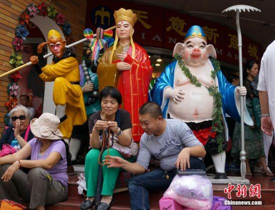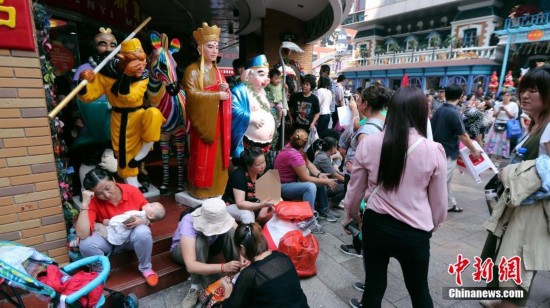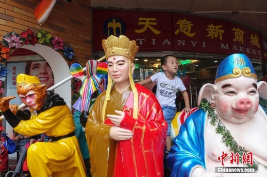 9月15日,一孩童坐在天意門前西游記師徒雕像上遠眺。當日,自1992年開業(yè)至今的北京天意市場迎來其在北京西城阜外大街營業(yè)的最后一日,商家趁機“瘋狂甩貨”,大批北京民眾也紛至沓來。這里曾是北京著名的小商品商城,聚集了數千家商戶。為疏解北京非首都功能,天意商城將于本月16日關門停業(yè)。中新社記者 崔楠 攝