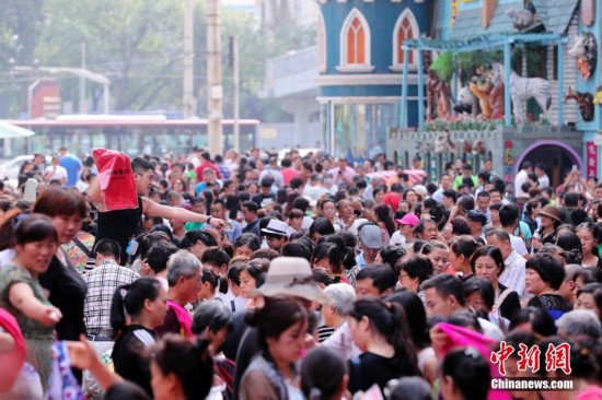 9月15日,商戶聚集在北京天意商城門口甩賣商品,吸引大批顧客搶購。天意商城是北京規(guī)模最大的小商品批發(fā)兼零售市場,為疏解北京非首都功能,天意商城將于9月16日關門停業(yè)。中新社記者 盛佳鵬 攝