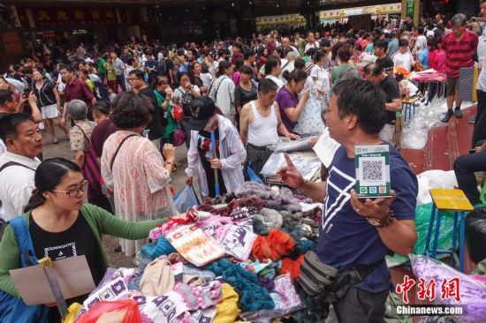 9月15日,天意商戶舉起二維碼方便顧客掃碼支付,以新式支付方式助力傳統(tǒng)零售。當日,自1992年開業(yè)至今的北京天意市場迎來其在北京西城阜外大街營業(yè)的最后一日,商家趁機“瘋狂甩貨”,大批北京民眾也紛至沓來。這里曾是北京著名的小商品商城,聚集了數千家商戶。為疏解北京非首都功能,天意商城將于本月16日關門停業(yè)。中新社記者 崔楠 攝