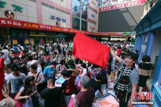 9月15日,商戶在北京天意商城甩賣商品,吸引大批顧客搶購。天意商城是北京規(guī)模最大的小商品批發(fā)兼零售市場,為疏解北京非首都功能,天意商城將于9月16日關門停業(yè)。中新社記者 盛佳鵬 攝
