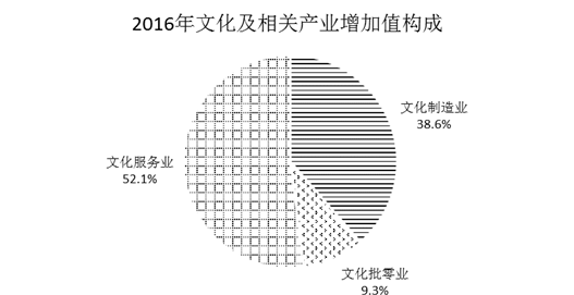按行業分,2016年文化制造業增加值為11889億元,比上年增長7.6%,占文化及相關產業增加值的比重為38.6%;文化批發零售業增加值為2872億元,增長13.0%,占9.3%;文化服務業增加值為16024億元,增長17.5%,占52.1%。