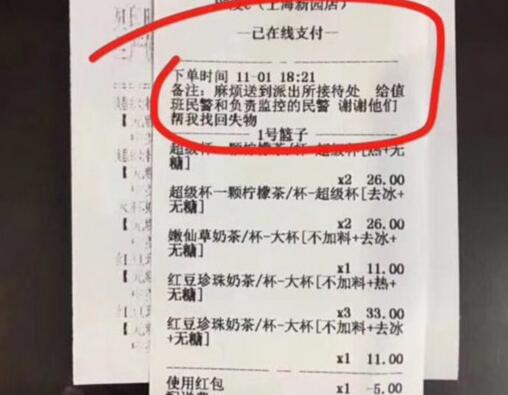 民警四處詢問了下,沒人下過單,快遞小哥連忙遞上手中的外賣單,上面寫著:麻煩送到派出所接待處,給值班民警和負(fù)責(zé)監(jiān)控的民警,謝謝他們幫我找回失物。