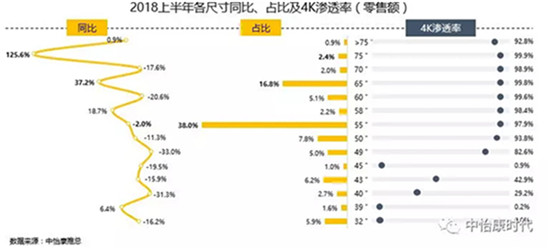 據中怡康推總數據,2018上半年,55英寸電視穩居第一大尺寸,零售額占比達到38%;65英寸占比16.8%,躍升為第二大尺寸。與此同時,65、75英寸大屏電視消費釋放出強勁活力,65英寸電視同比增長37.2%,75英寸電視同比增長高達125.6%,用戶對于大屏彩電的消費熱度大幅提高。5gX安康新聞網