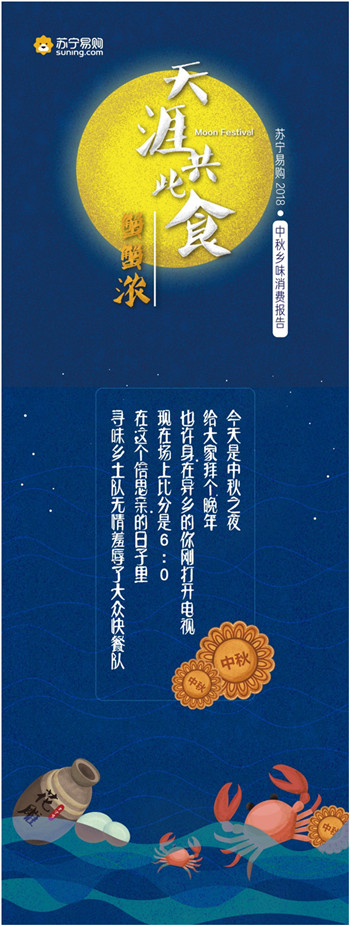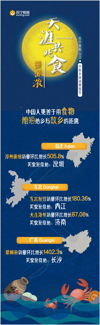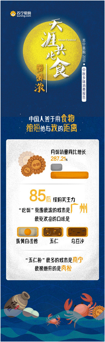 9月23日,蘇寧易購發(fā)布了“天涯共此食·中秋鄉(xiāng)味消費報告”。報告顯示,中秋節(jié)期間蘇寧易購月餅銷量同比增長287.21%,五仁月餅一改以往被“嫌棄”的形象,成為最受歡迎的口味之一;大閘蟹銷量同比增長1821%,4兩公蟹與3兩母蟹的組合賣得最好,南京一舉成為“最敢吃螃蟹”的城市。