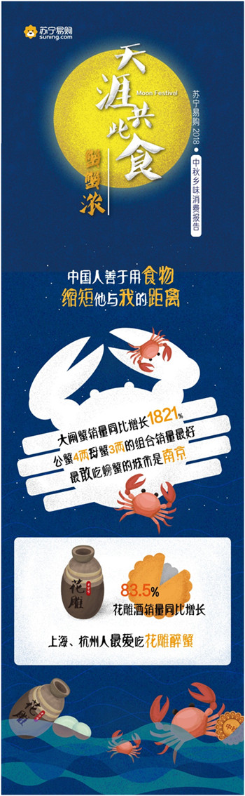 如今,大閘蟹已經(jīng)成為人們中秋餐桌上的標配。今年4月,蘇寧生鮮與陽澄湖大閘蟹協(xié)會展開戰(zhàn)略合作,蘇寧線上自營的大閘蟹全部都來自陽澄湖。9月以來,蘇寧易購大閘蟹的銷量同比增長為1821%,南京、上海、北京、廣州、沈陽成為“最敢吃螃蟹”的城市,4兩公蟹3兩母蟹的組合最受消費者歡迎。此外,蘇寧易購花雕酒的銷量也同比增長83.5%,數(shù)據(jù)顯示,上海和杭州人最愛吃花雕醉蟹。