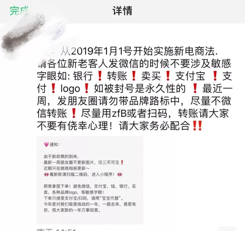 新《電商法》雖然沒有對微商、個人代購的監管沒有出具體細則,代購圈內卻已流傳了多個監管措施版本,比如“敏感字眼交易雙方封號”、“不能微信直接付款”、“朋友圈限流和降權”等。