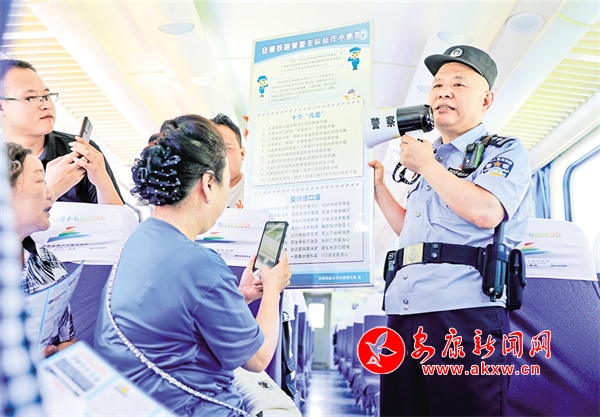 “我已經發展了三個志愿者!”老范一邊興高采烈地說著,一邊從他的工作包中找出志愿者袖標及徽章。就在剛才,在站臺上引導旅客上車的老范憑著自己的親和力,很快就物色了幾名自愿擔任平安列車志愿者的旅客。老范隨后給志愿者佩戴袖標及徽章,給他們開展崗前培訓,帶他們在列車上開展反詐和防盜等安全宣傳。