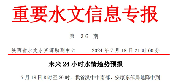 2024年7月19日10時18分接到省應急廳第192號《暴雨橙色預警》:預計未來3小時我市漢濱區、寧陜縣降雨量將達50 毫米以上,未來6小時我市漢陰縣、石泉縣、旬陽市、白河縣將達50毫米以上,以上地區境內發生山洪、泥石流等災害風險較高。