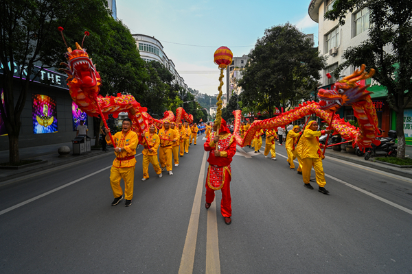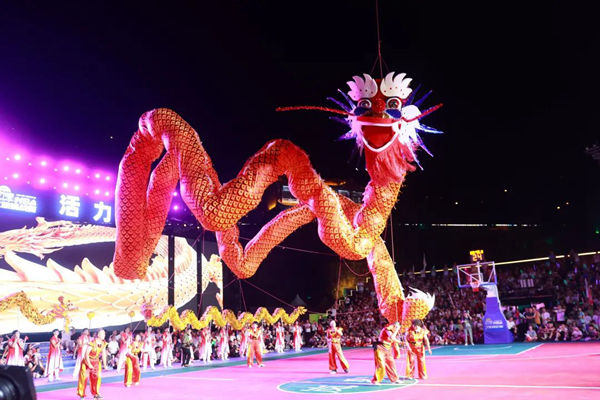 開幕式規模宏大,異常精彩。貴州廣播電視臺知名節目主持人、貴州村BA節目主持人李旭涵、劉子豪兩位重量級主持人親臨主持,熟練專業而又激情的引導互動為開幕式晚會增添爆棚氛圍。歌手沙寶亮傾情演唱《最初的信仰》《又回首》《暗香》等歌曲,世界散打冠軍、國家散打隊主教練許家恒,全國競走冠軍陳珍、全國青運會冠軍田紫丹的互動以及本土節目《旗開得勝》《歡迎你到嵐皋來》《巴山魔芋情》等將嵐皋豐厚的旅游資源、特色產品、人文風情展現得淋漓盡致。無比酷炫的燈光秀、煙花秀閃耀全場,56米巨龍騰空而起,光與影的交織變換構成了一幅幅絕妙畫卷,現場掌聲雷動,喝彩聲、吶喊聲此起彼伏。