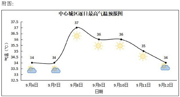 本網訊 9月6日12時,市氣象臺發布重要天氣報告:根據最新氣象觀測資料和數值預報分析,預計我市未來一周無區域性有效降水,仍維持晴熱少雨,8-11日將出現35℃以上高溫天氣,局地最高氣溫可達38℃以上;秦嶺和巴山沿線午后到夜間多分散性強對流性天氣,局地伴有短時強降水(10~30 毫米/小時)和雷暴大風天氣。