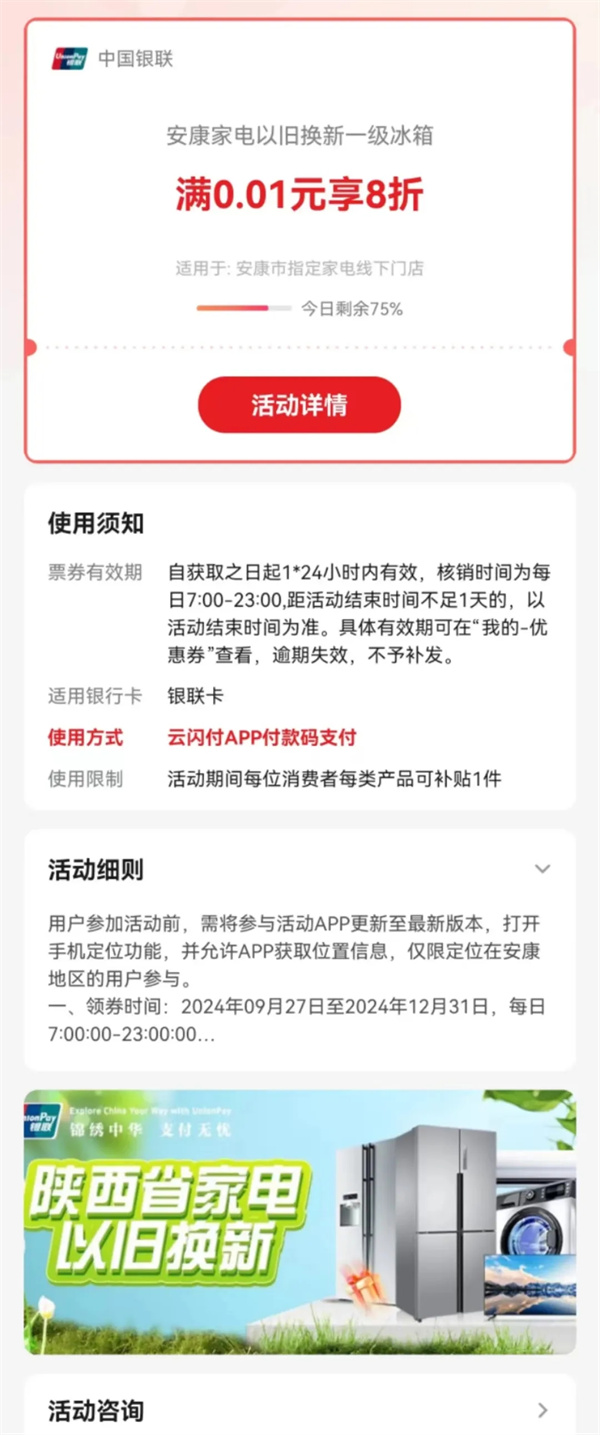 3.查看與使用:領(lǐng)取成功后,您可以在云閃付APP“我的-獎勵-我的票券”中查看已領(lǐng)取的消費券。在參與活動的家電銷售門店選購指定家電產(chǎn)品時,出示并使用消費券,即可享受相應(yīng)折扣。