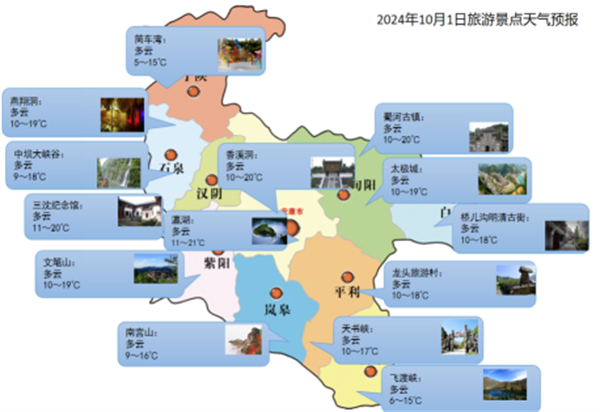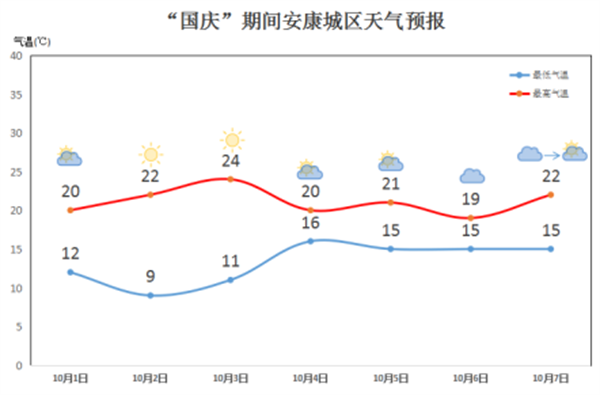 節(jié)假日期間我市受前期降水及冷空氣影響,氣溫較低。預計國慶期間我市最高氣溫:川道地區(qū):22-24℃,高山地區(qū):20-22℃,最低氣溫:川道地區(qū)10-14℃,高山地區(qū):5-10℃。