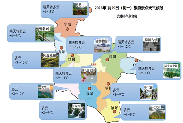 今天白天到明天白天我市有明顯的雨雪降溫天氣,春節期間,初二到初四(1月30日至2月1日)有弱的雨雪降溫天氣,恰逢春運春節返鄉、旅行等出行高峰時段,包茂高速、麻安高速、十天高速、G541等高速及秦嶺和巴山高山的部分路段需注意道路濕滑、結冰,低能見度對交通安全的不利影響,防范雨雪天氣造成的道路擁堵和交通事故;公眾行車注意小心慢行。其余時段我市天氣較利于出行。