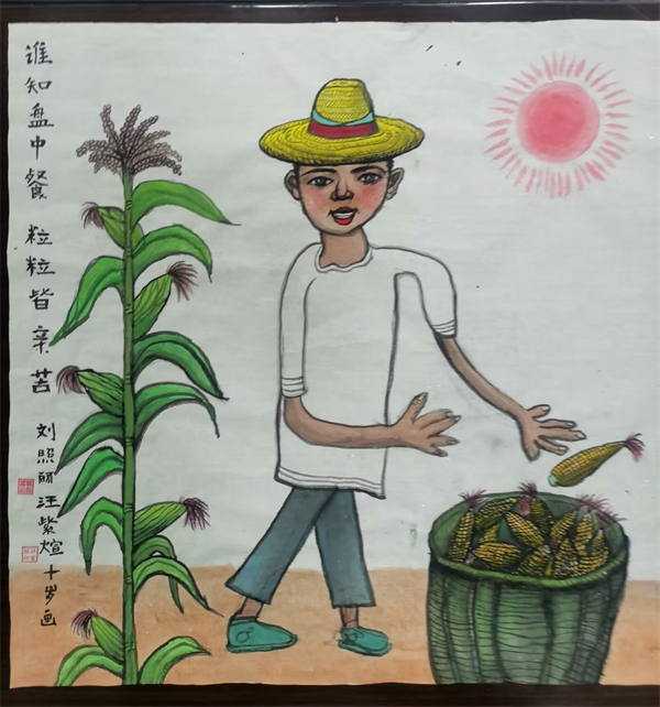 四年級的汪紫煊在參加夏令營時,在玉米田里看到一幕,深深地吸引了她,一位農民伯伯戴著草帽在烈日下,把玉米裝進筐里。曾經學過的詩句在她腦海里浮現,文字變成了立體的畫面,她為自己這幅畫起名《誰知盤中餐 粒粒皆辛苦》。汪紫煊覺得,這種吃苦耐勞的精神要發揚,更要珍惜糧食,感受糧食的來之不易。