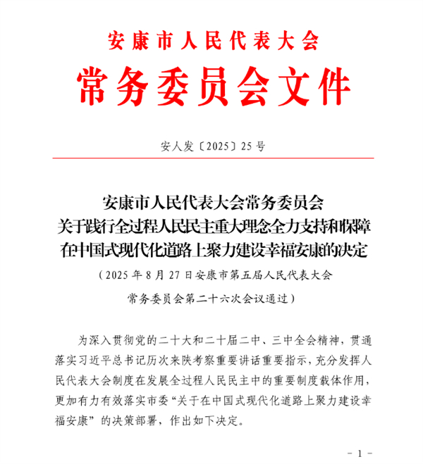 本網訊(通訊員 周清華 張凡)8月27日,安康市五屆人大常委會第二十六次會議作出《安康市人民代表大會常務委員會關于踐行全過程人民民主重大理念全力支持和保障在中國式現代化道路上聚力建設幸福安康的決定》(以下簡稱《決定》),并自印發之日起實施。以地方人大常委會作出重大事項決定的形式,將黨的主張通過法定程序轉化為全體人民的共同意愿,是安康市人大常委會強化擔當、依法履職的創新實踐,是圍繞中心、服務大局的務實舉措,必將為在中國式現代化道路上聚力建設幸福安康注入堅實的人大力量。
