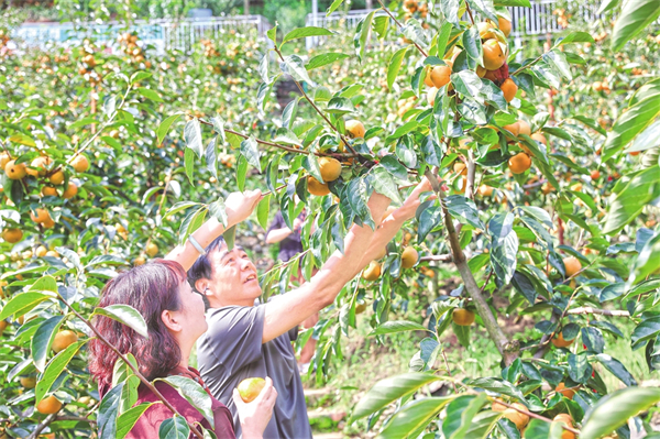 10月8日,游客在石泉縣城關鎮絲銀壩村脆甜柿子果園體驗采摘樂趣。許兵 攝9KX安康新聞網