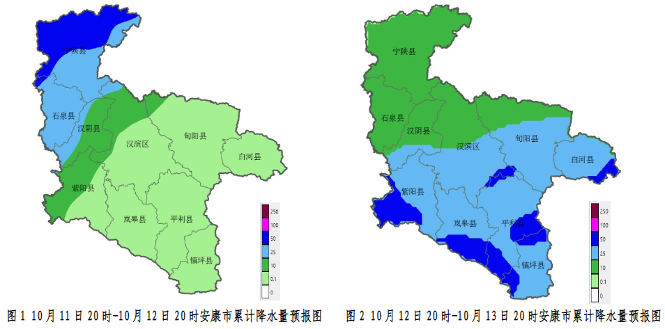 10月12日:全市大部陰天轉(zhuǎn)大雨(25~45毫米),紫陽(yáng)大部、嵐皋南部、平利中南部、鎮(zhèn)坪、漢濱南部、白河局地有暴雨(超過(guò)50毫米),過(guò)程期間局地伴有雨強(qiáng)超過(guò)10毫米/小時(shí)的強(qiáng)降水;XzJ安康新聞網(wǎng)