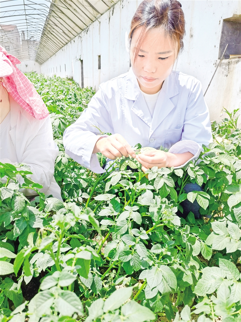 鄭敏正在進(jìn)行馬鈴薯授粉工作