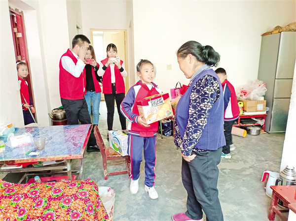 10月10日,石泉云霧山鎮中心小學組織部分學生為社區老人整理房間、打掃衛生,還為老人送上節日的禮物。 譚相華 攝