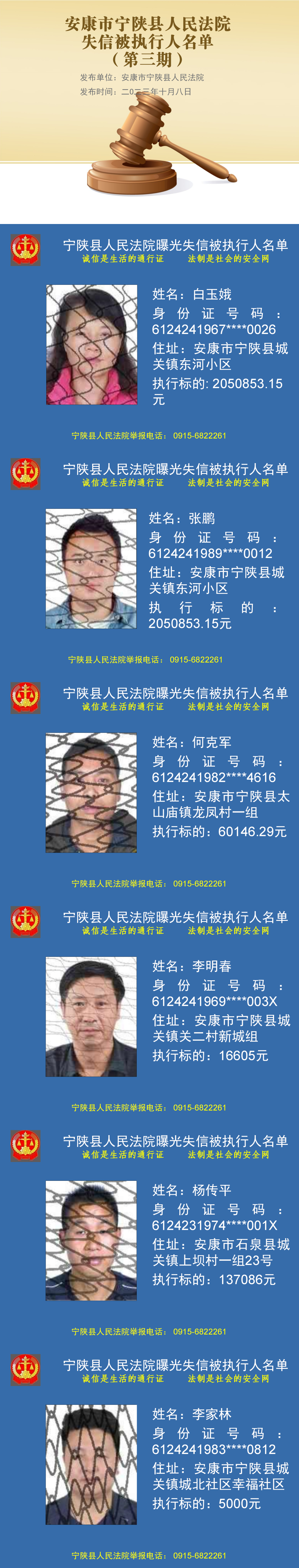 為維護司法權威,推動社會誠信體系建設,促使被執行人履行生效法律文書確定的義務,根據《中華人民共和國民事訴訟法》第二百五十五條和《最高人民法院關于公布失信被執行人名單信息的若干規定》的規定,被執行人具有履行能力而不履行生效法律文書確定的義務,人民法院應當將其納入失信被執行人名單,依法對其進行信用懲戒。現將安康市寧陜縣人民法院2023年第三期失信被執行人名單予以公布。