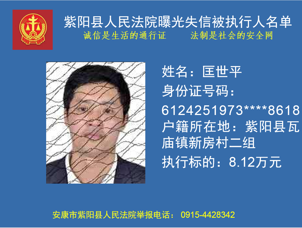 被執(zhí)行人匡世平,你因不履行(2017)陜0924民初241號民事判決書確定的義務,已被紫陽縣人民法院納入失信被執(zhí)行人名單庫依法進行信用懲戒。信用懲戒范圍包括但不限于以下措施: