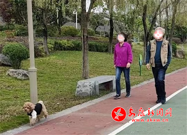 11月9日上午,漢江公園人行步道,有市民遛狗未牽繩。(圖文/馬歡)2w8安康新聞網