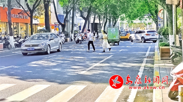 6月22日,安康中心城區金州南路,行人橫穿馬路,不走斑馬線。(記者 吳單 攝)……