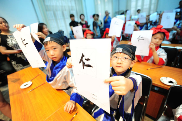 8月28日,天津市河西區馬場道小學的一年級新生在天津文廟開筆典禮上“擊鼓鳴志”。新學期伊始,天津市河西區馬場道小學的92名一年級新生身穿古典服飾,在天津文廟……