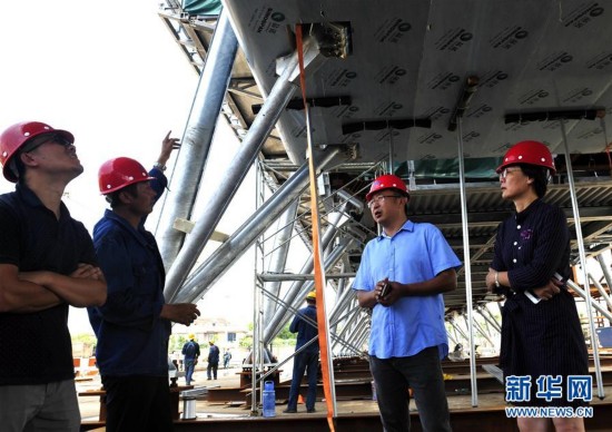 中國電子進出口總公司費拉茲站建設項目組經理曹虹(右一)和副經理焦陽(右二)在位于上海的預拼裝現場檢查施工進度(8月25日攝)。ePR安康新聞網