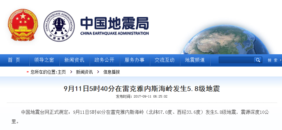 北京時間9月11日5時40分,在雷克雅內斯海嶺(北緯57.0度、西經33.6度)發生5.8級地震,震源深度10公里。7HU安康新聞網
