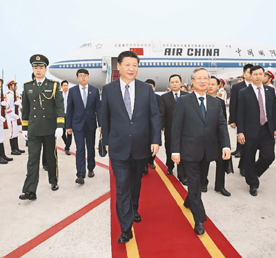 當地時間上午11時10分許,習近平乘坐的專機抵達河內內排國際機場。習近平步出艙門,越共中央政治局委員、中央書記處常務書記、中央檢查委員會主任陳國旺等在舷梯旁迎接。越南青年向習近平獻上鮮花。禮兵分列紅地毯兩側。身著盛裝的越南群眾揮舞著中越兩國國旗歡迎習近平。
