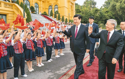 | 11月12日,中共中央總書記、國家主席習近平在河內越共中央駐地同越共中央總書記阮富仲舉行會談。圖為會談前,阮富仲在主席府廣場為習近平舉行盛大歡迎儀式。 |