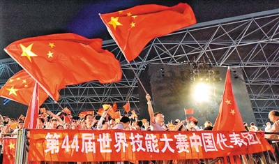 | 圖為日前在阿拉伯聯合酋長國舉行的第44屆世界技能大賽開幕式上,人們揮舞著中國國旗歡迎中國代表團入場。 |