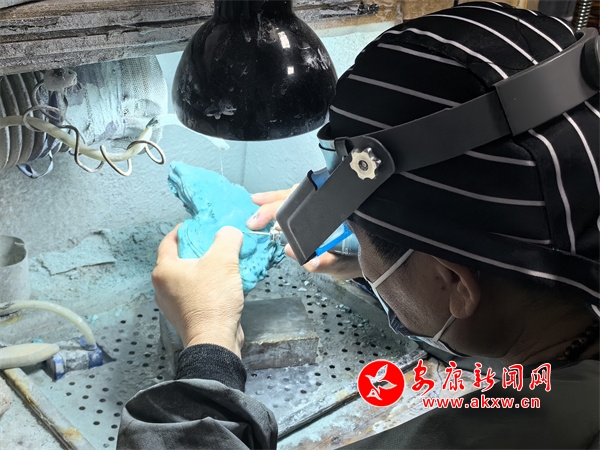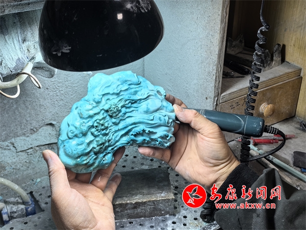 中國寶石琢玉藝術家徐安對白河綠松石進行雕刻
