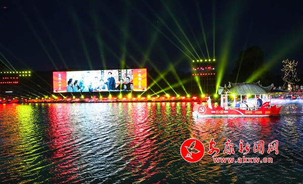晚會(huì)在嘹亮激昂的獨(dú)唱《東方紅》中拉開(kāi)序幕,緊接著,磅礴大氣的歌舞串燒《我和我的祖國(guó)》《萬(wàn)疆》《愛(ài)我中華》,如詩(shī)如畫(huà)的水上表演《南湖紅船》《江南水鄉(xiāng)》《滾滾長(zhǎng)江東逝水》,動(dòng)力澎湃的RAP時(shí)尚秀《門戶新安康》,美輪美奐歌舞表演《我的深情為你守候》《為祖國(guó)干杯》《送你一個(gè)長(zhǎng)安》《我愛(ài)你,中國(guó)》《領(lǐng)航》等節(jié)目相繼登臺(tái)表演,與此同時(shí),絢麗多彩的燈光秀和仙氣飄飄的霧森特效穿插其中,不斷將演出推向高潮。最后,整場(chǎng)演出在大合唱《沒(méi)有共產(chǎn)黨就沒(méi)有新中國(guó)》的歌聲中圓滿落下帷幕。