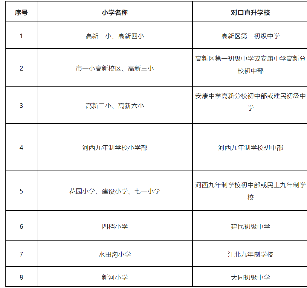 四、安康高新區2023年小升初對口直升一覽表