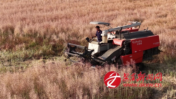“我們有一臺(tái)直收的收割機(jī),還有兩臺(tái)分段收割的收割機(jī),比人工快多了,一畝田有個(gè)十幾分鐘就收完了。”一臺(tái)新型現(xiàn)代化收割機(jī)在田間來(lái)回穿梭,田里的秸稈茬口整齊如梳,剛卸下的菜籽在陽(yáng)光下泛著油光。據(jù)了解,該合作社400畝示范基地全部采用機(jī)械化收割,起到了良好的示范推廣作用。