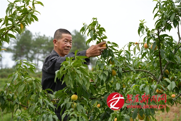 雙乳鎮江河村的黃桃產業園里也是一派豐收忙碌的喜人景象。成片的桃樹上,一顆顆成熟的黃桃身披紙質“防護衣”,密密麻麻掛滿枝頭,微風拂過,果香撲鼻,令人饞涎欲滴。務工群眾在林間來回穿梭,忙著采摘、運輸成熟的黃桃,桃林間一片繁忙。