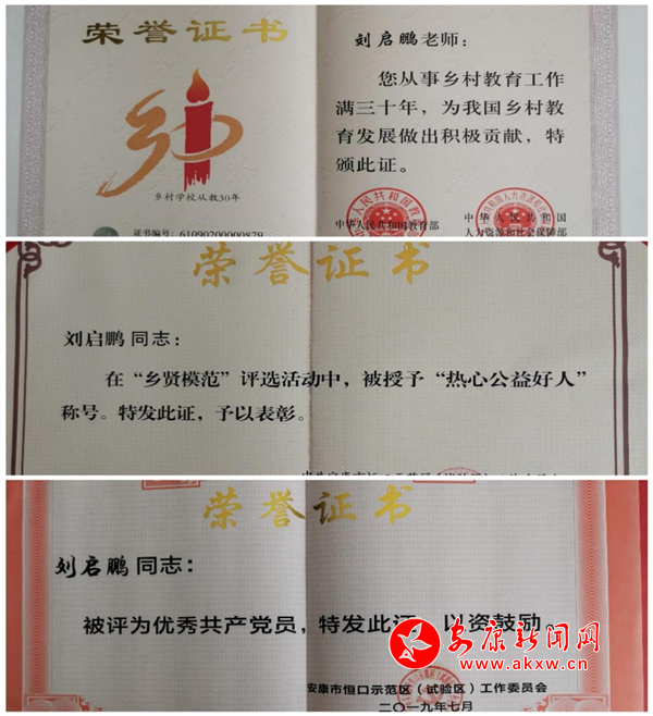 劉啟鵬先后獲得教育部、人力資源和社會保障部授予“鄉村學校從教30年”榮譽證書,被區鎮評為“鄉賢模范”和“優秀共產黨員”等先進個人。