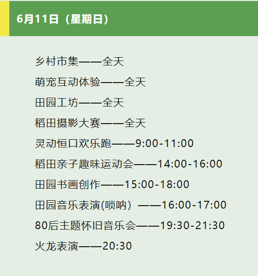 當日,現場還舉辦了稻田拔河、稻田摸魚、稻田摔跤等娛樂活動和田園古箏表演、70后主題懷舊音樂會、火龍表演等演出活動,吸引眾多游客朋友前來打卡。6月11日,靈動恒口歡樂跑、親子趣味運動會、嗩吶音樂表演、80后主題懷音樂會等活動精彩繼續......