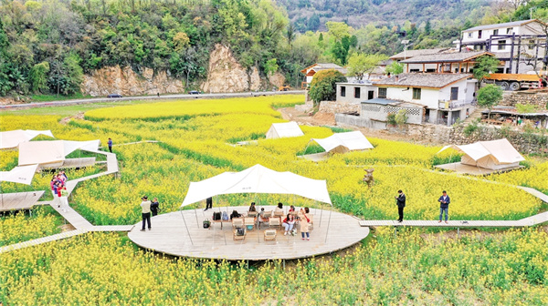 陽(yáng)春三月,秦嶺腳下,春風(fēng)彌漫,油菜花開(kāi)得正旺,朱鹮掠過(guò)古村青瓦。白墻黛瓦的民宿群中,咖啡濃香與油菜花香交織,令游人流連忘返,返鄉(xiāng)青年正在直播推介農(nóng)貨………