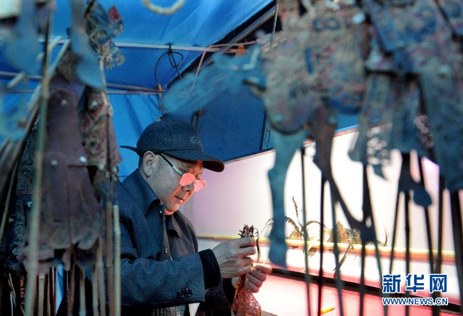 3月15日,平利縣國家非遺文化傳承人吳承權正在準備道具為群眾表演弦子腔。在巴山深處的陜西平利縣,活躍著一批皮影戲弦子腔藝人。他們常常利用休息日走上街頭,……