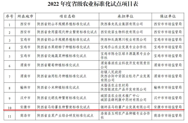 本網(wǎng)訊(通訊員 李東昇 李秦鄂)10月24日,陜西省市場(chǎng)監(jiān)管局發(fā)布了2022年度省級(jí)農(nóng)業(yè)標(biāo)準(zhǔn)化試點(diǎn)項(xiàng)目,由鎮(zhèn)坪縣市場(chǎng)監(jiān)管局推薦,鎮(zhèn)坪縣馬鈴薯產(chǎn)業(yè)發(fā)展有限公司承擔(dān)的馬鈴薯良種繁育標(biāo)準(zhǔn)化試點(diǎn)項(xiàng)目榜上有名。據(jù)悉,此次全省獲批的項(xiàng)目僅有11個(gè)。該項(xiàng)目也是安康市2022年度唯一一個(gè)省級(jí)農(nóng)業(yè)標(biāo)準(zhǔn)化試點(diǎn)項(xiàng)目。