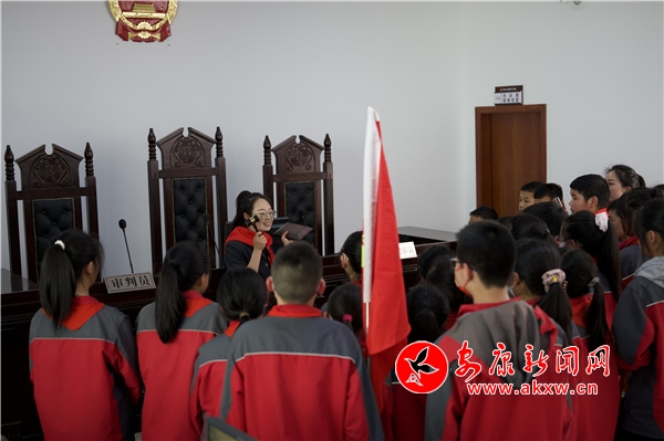 在參觀過程中,干警帶領同學們走進訴訟服務中心和干警辦公室了解了法院干警的工作場所。隨后,帶領同學們參觀審判庭,現場向同學們介紹科技審判法庭的功能及庭審流程,并展示了法袍、法槌和法徽,同時用深入淺出的語言和提問互動的方式向孩子們講解了法袍、法槌和法徽的象征意義,同學們興趣濃厚,紛紛走上審判臺,親身感受和觸摸審判設施,感受法庭審判的嚴肅和莊重。