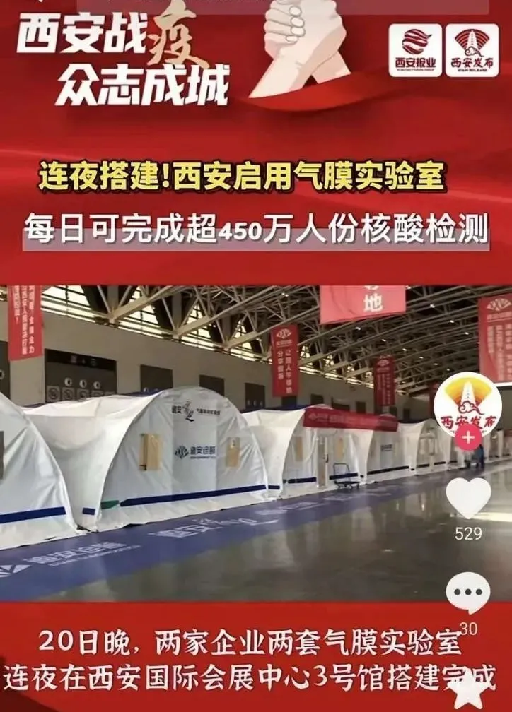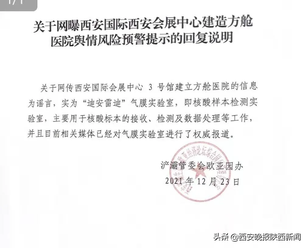 近日,短視頻平臺(tái)有網(wǎng)民發(fā)視頻稱“西安國(guó)際會(huì)展中心正在建方艙醫(yī)院”,經(jīng)核實(shí),該信息為謠言,實(shí)為“迪安雷迪”氣膜實(shí)驗(yàn)室,用于核酸檢測(cè)工作。ZVg安康新聞網(wǎng)