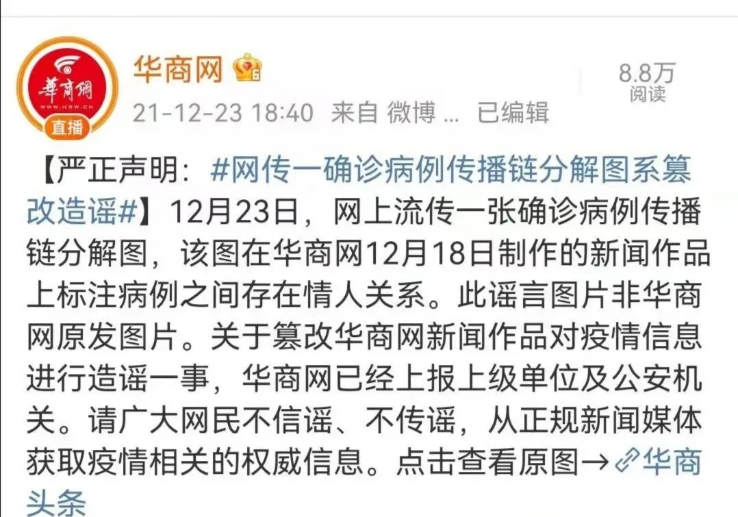 網(wǎng)上流傳一張確認(rèn)病例傳播鏈分解圖,在病例之間標(biāo)注“情人”關(guān)系,并傳言此次疫情傳播因素之一,是因?yàn)槲靼彩桌±c子牛門診的護(hù)士為情人關(guān)系,導(dǎo)致疫情擴(kuò)散,經(jīng)核實(shí),該圖盜用華商網(wǎng)12月18日制作的新聞作品圖片。該信息為虛假信息,造謠的人已被拘留。ZVg安康新聞網(wǎng)