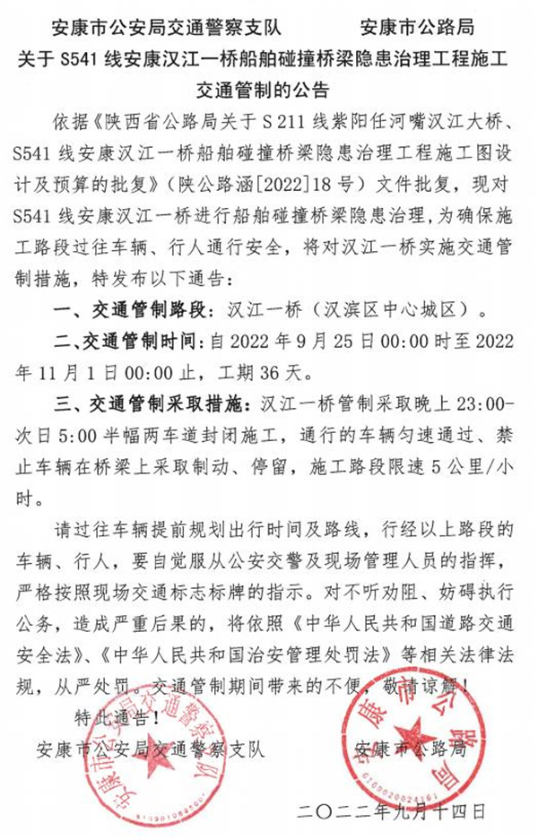 9月25日至11月1日安康漢江一橋?qū)⑦M(jìn)行船舶碰撞橋梁隱患治理工程施工,將對漢江一橋?qū)嵭?strong>交通管制36天,管制采取晚上23:00-次日5:00半幅兩車道封閉施工,通行的車輛勻速通過,禁止車輛在橋梁上采取制動(dòng)、停留,施工路段限速5公里/小時(shí)。qmU安康新聞網(wǎng)
