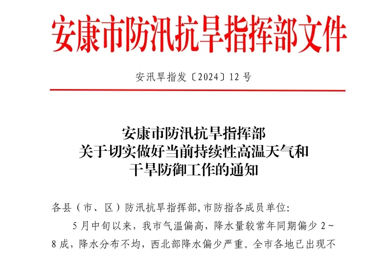6月12日,安康市防汛抗旱指揮部發(fā)布《關(guān)于切實做好當前持續(xù)性高溫天氣和干旱防御工作的通知》。