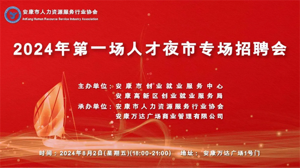 為有效保障企業(yè)用工需求,促進(jìn)未就業(yè)高校畢業(yè)生、退役軍人、城鎮(zhèn)失業(yè)人員、返鄉(xiāng)農(nóng)民工等各類人員就業(yè),安康市創(chuàng)業(yè)就業(yè)服務(wù)中心、安康高新區(qū)創(chuàng)業(yè)就業(yè)服務(wù)局定于2024年8月2日(星期五)在安康高新區(qū)萬(wàn)達(dá)廣場(chǎng)1號(hào)門舉辦2024年第一場(chǎng)人才夜市專場(chǎng)招聘會(huì),現(xiàn)將活動(dòng)事項(xiàng)公告如下: