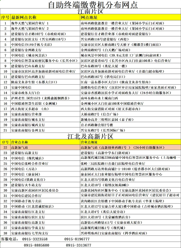 為進一步方便廣大用戶購買天然氣,我公司在電信營業廳、建設銀行、農商銀行及便民服務點等網點布設38臺天然氣自助終端繳費機。現溫馨提示您關注“安康市逸華天然氣有限公司”微信公眾號查看自助機分布網點,選擇就近網點進行天然氣充值。其他業務可在工作時間內前往以下人工服務大廳或窗口辦理,部分業務也可通過微信公眾號的“微營業廳”辦理: